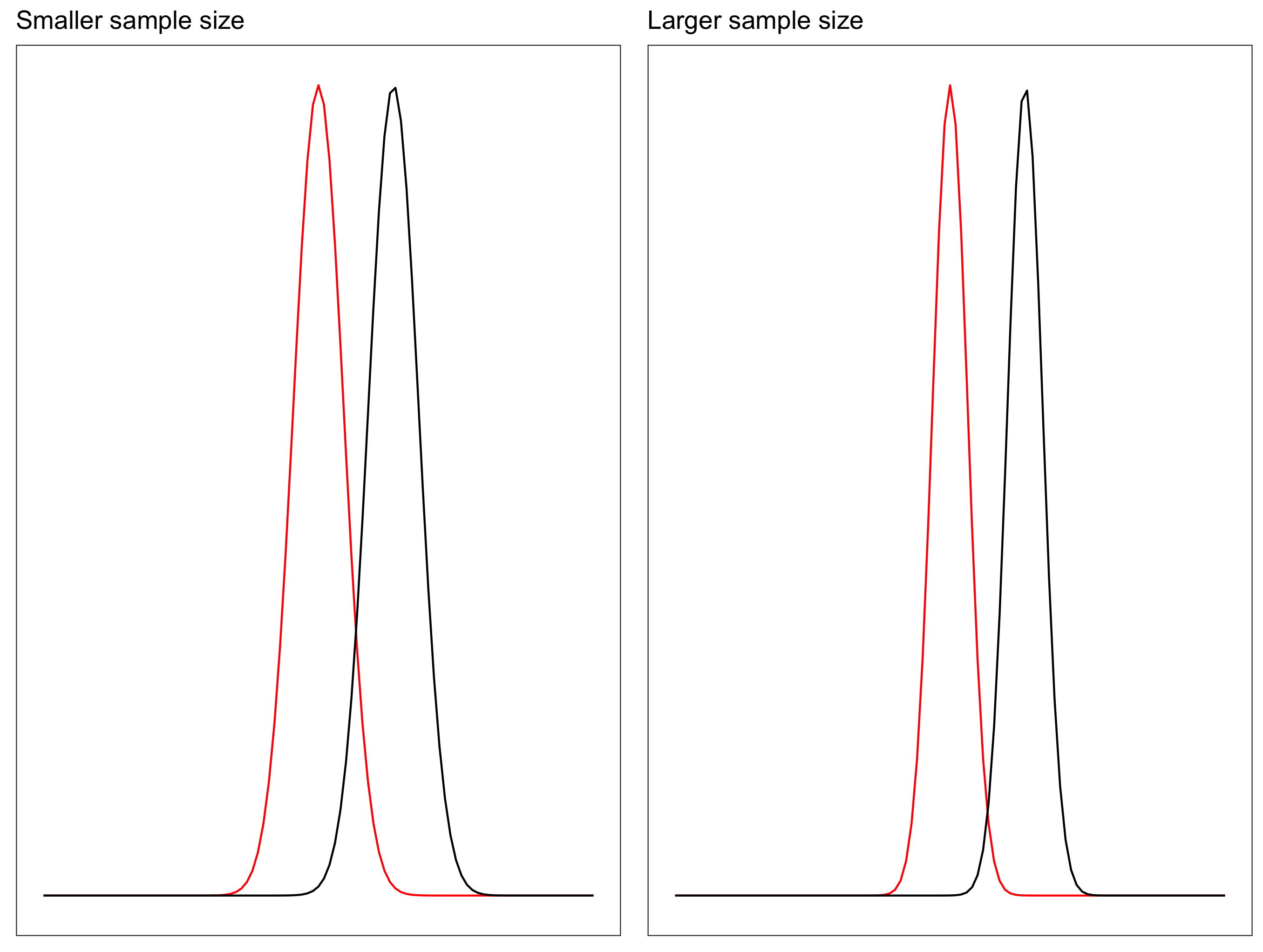 Increasing sample size will also increase the power, as with the higher sample size the sampling distribution of the mean becomes narrower. Recall, the standard deviation of the sampling distribution (Standard Error) of the mean is calculated as: \[SE = \frac{\sigma}{\sqrt{n}}\]