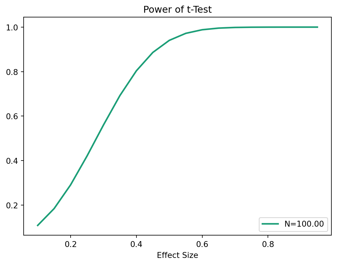 Plot power and effect size using python, sample size = 100