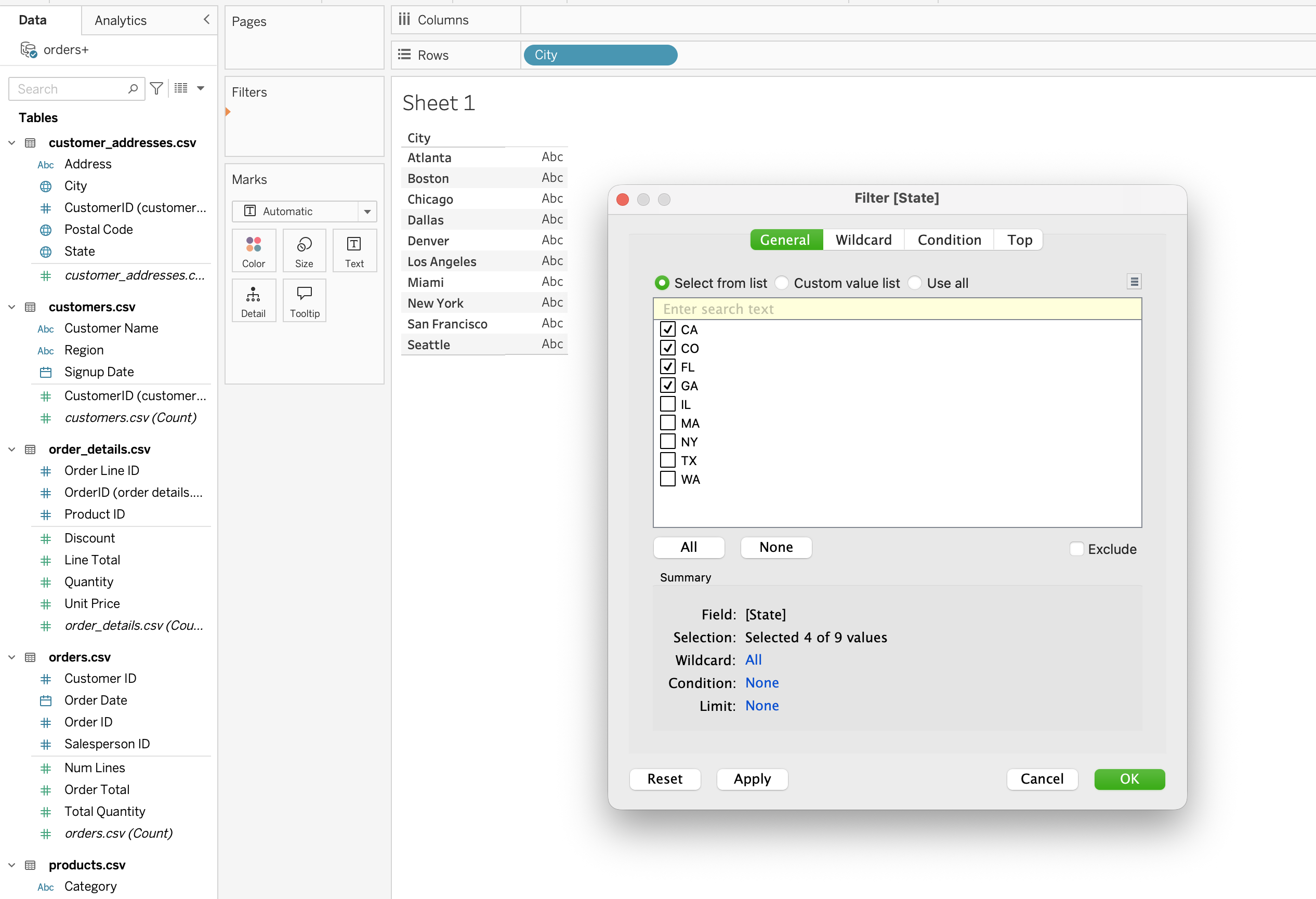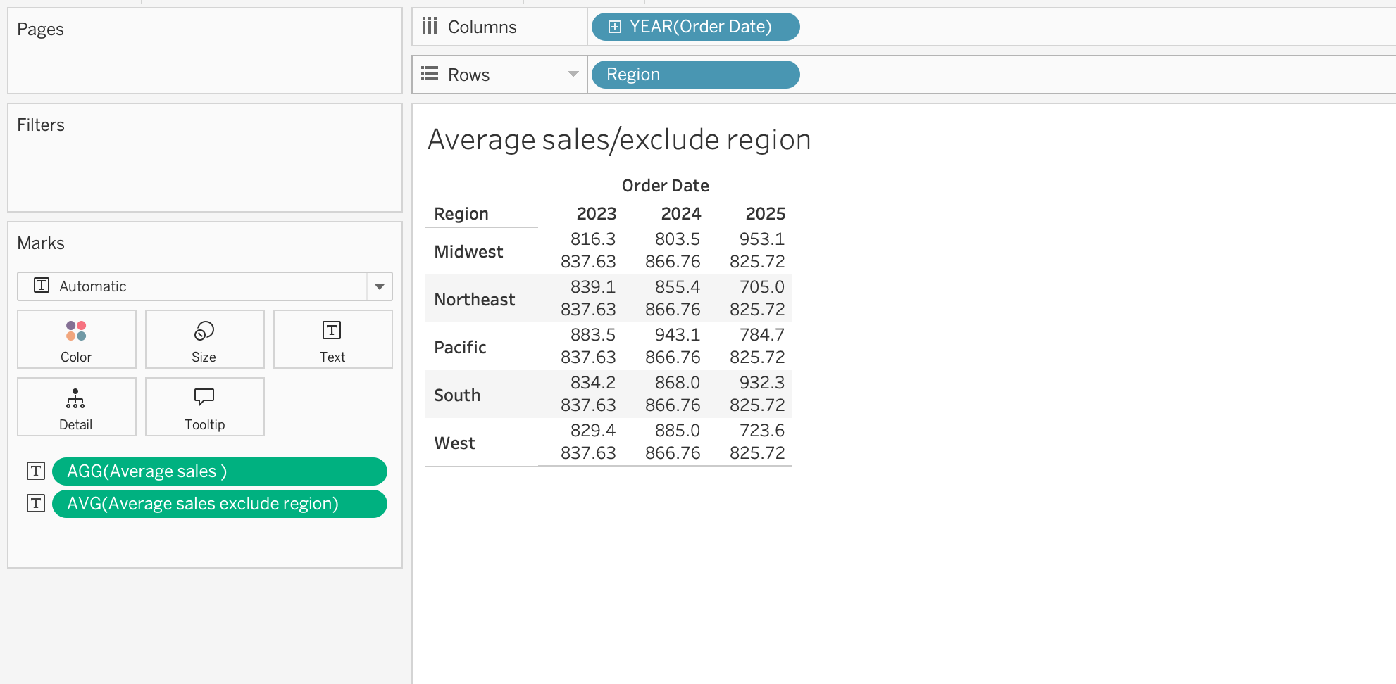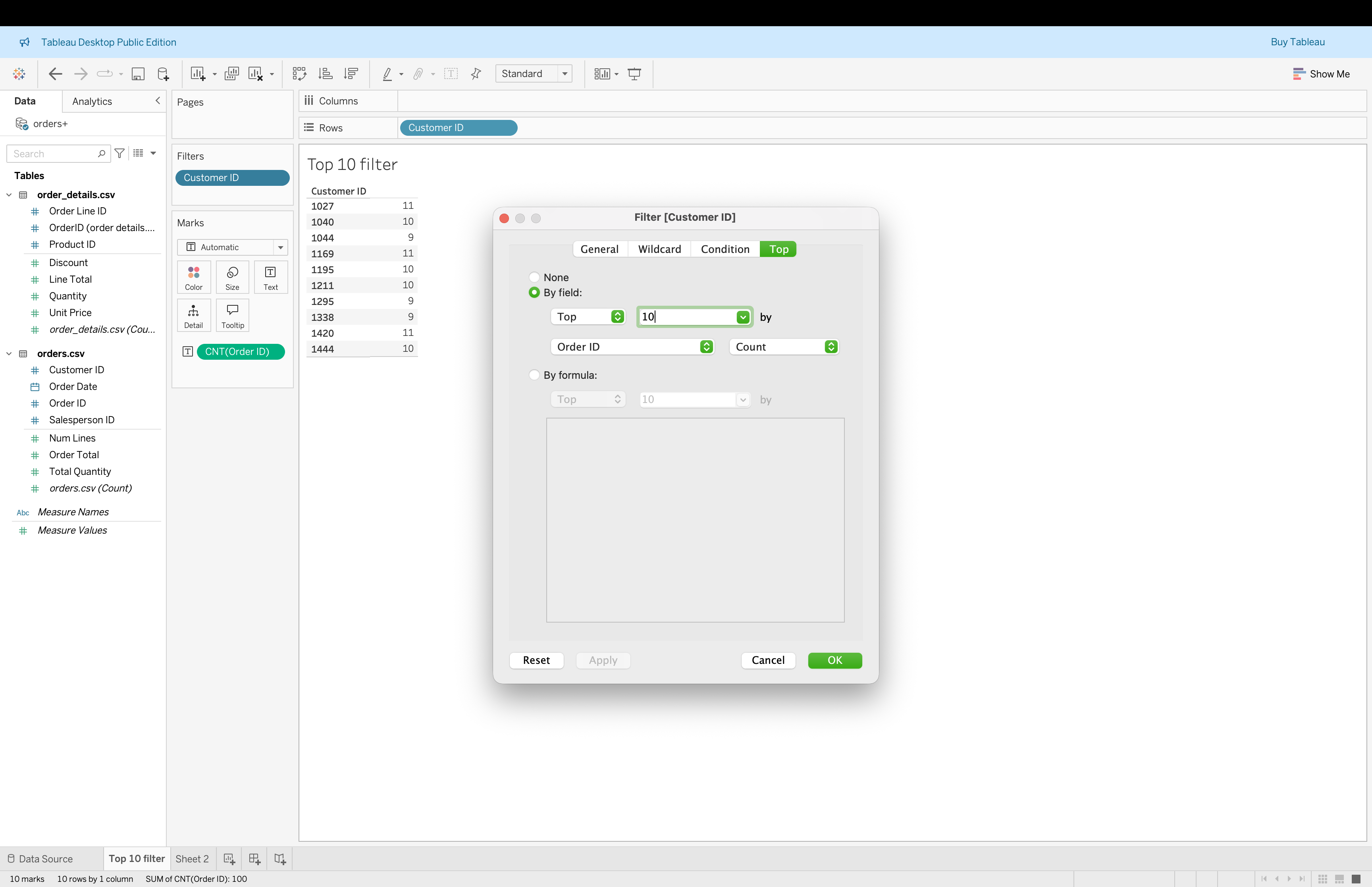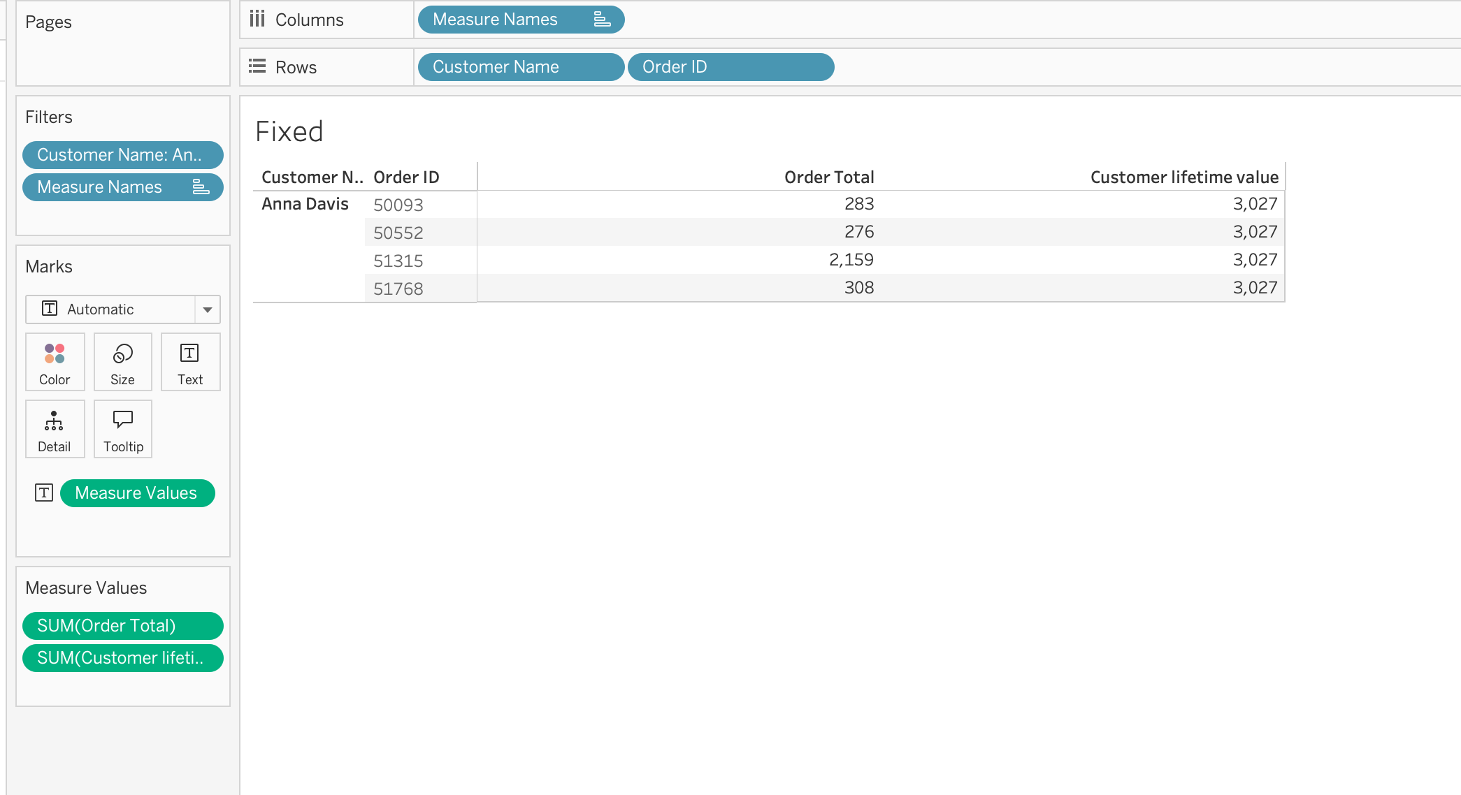 { FIXED [Customer ID] : SUM([Sales]) }If [Region] is placed in context, the calculation is now evaluated only for the selected region.