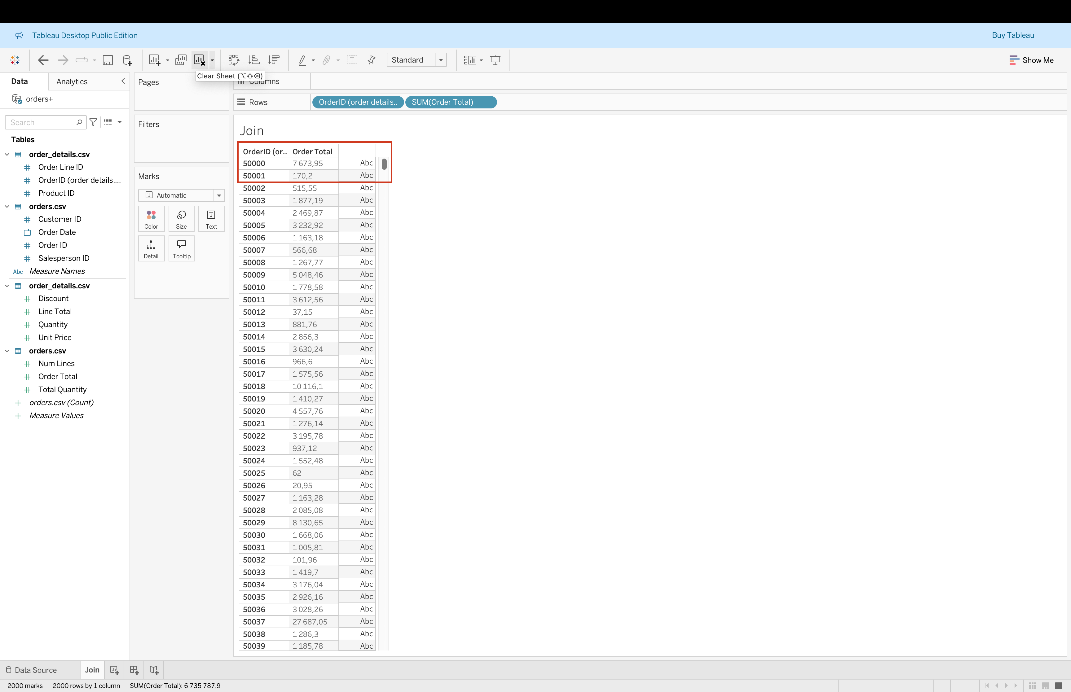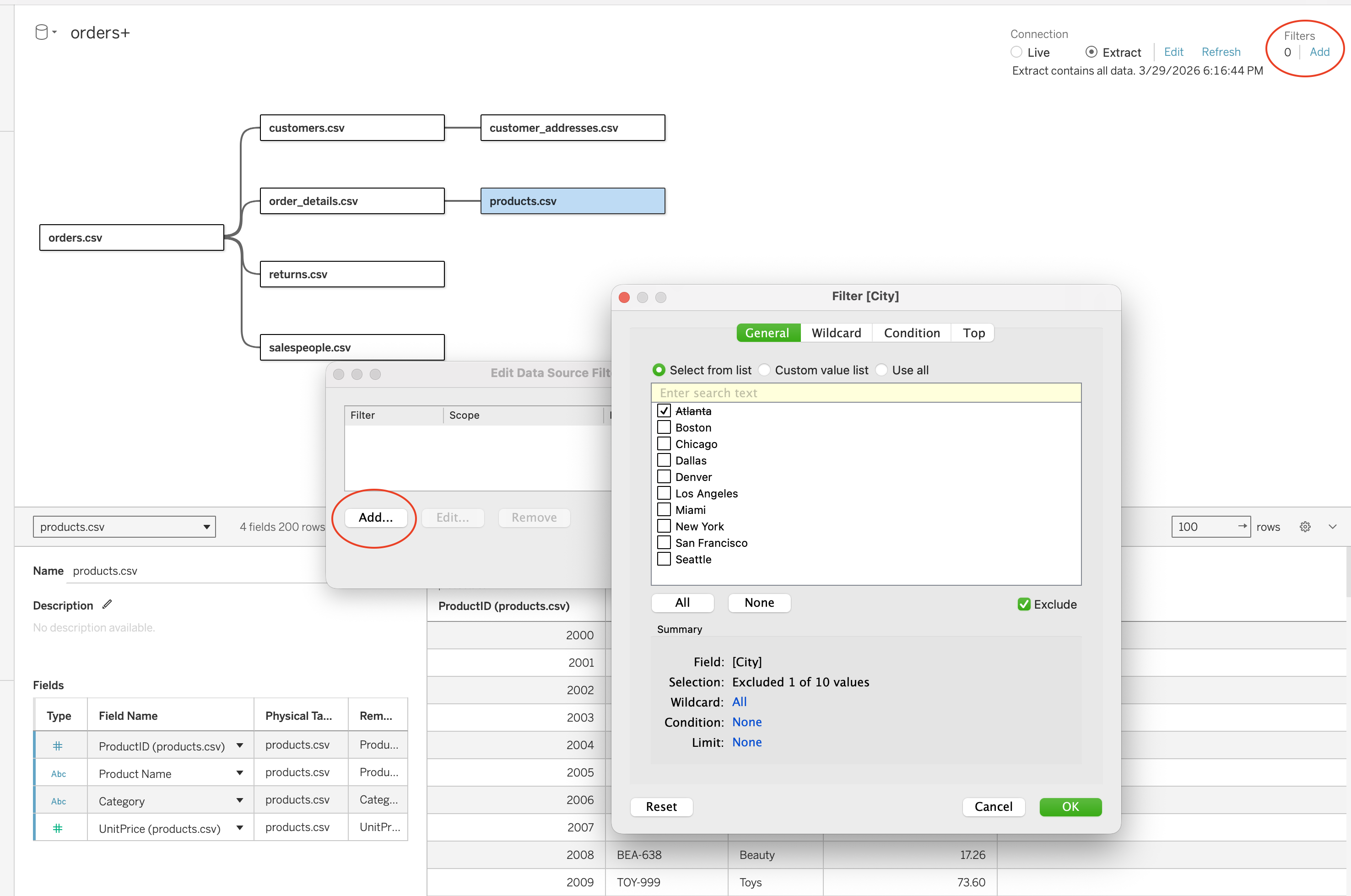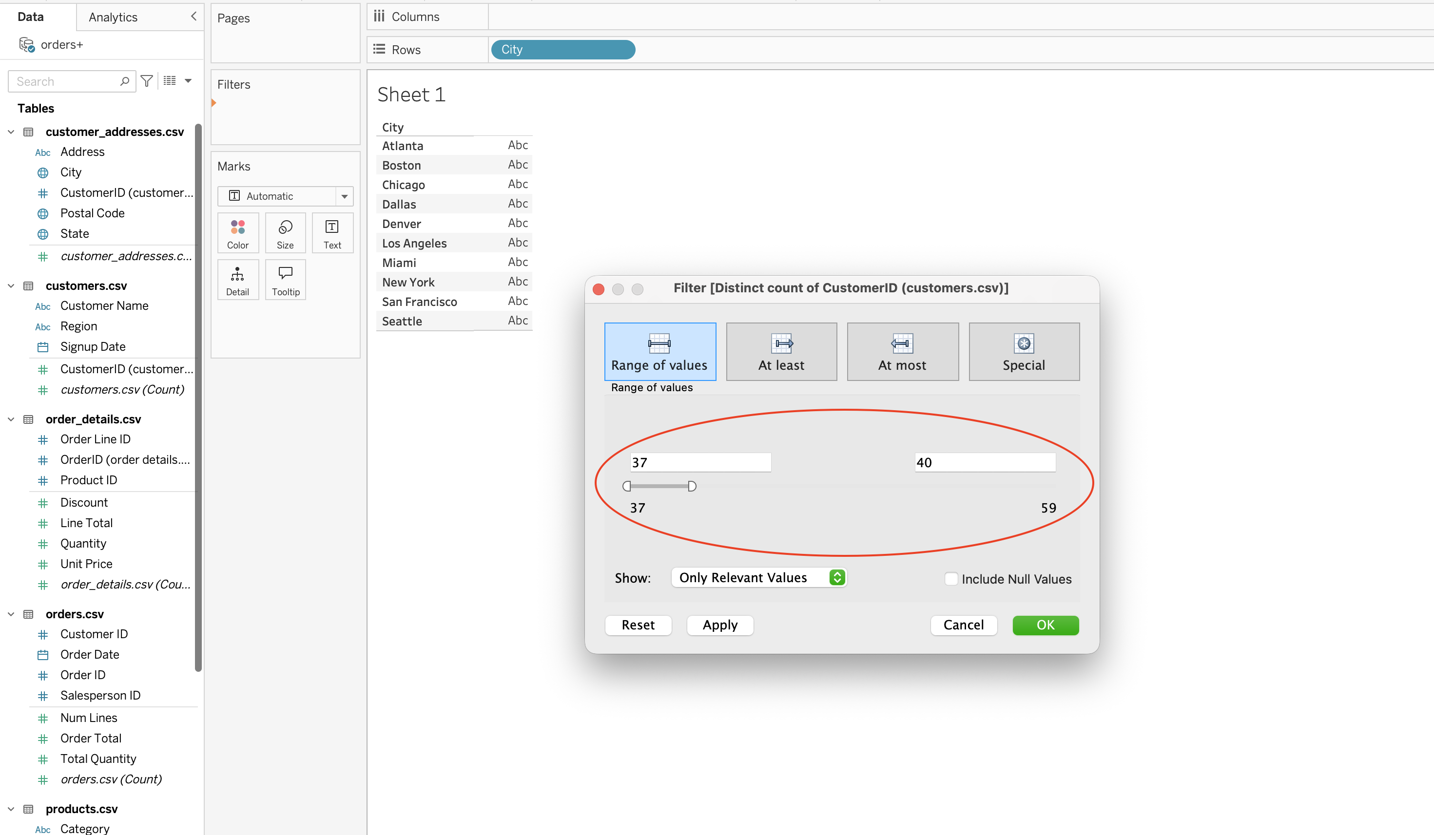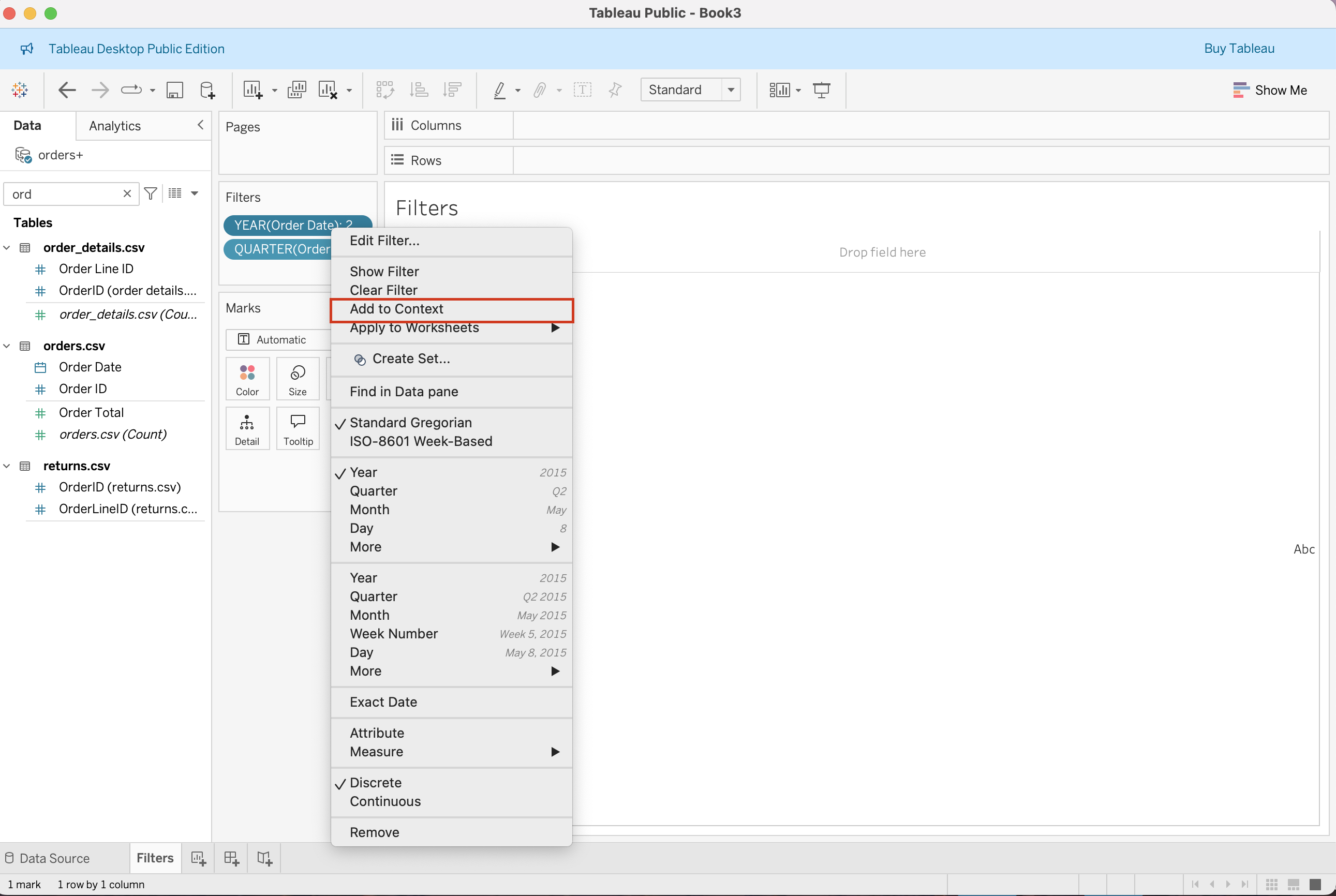 { FIXED [Customer ID] : SUM([Sales]) }If [Region] is placed in context, the calculation is now evaluated only for the selected region.