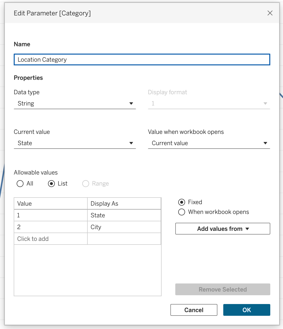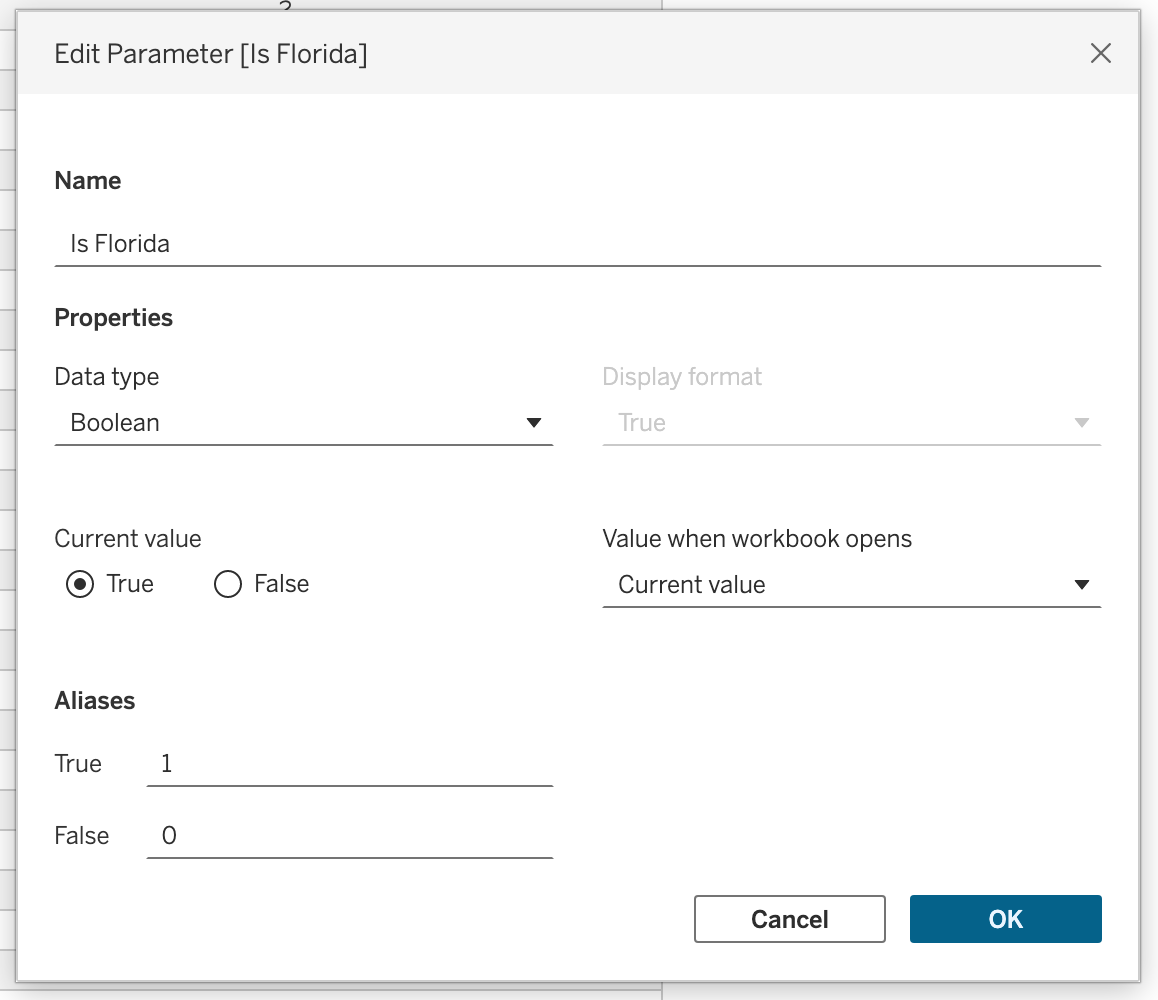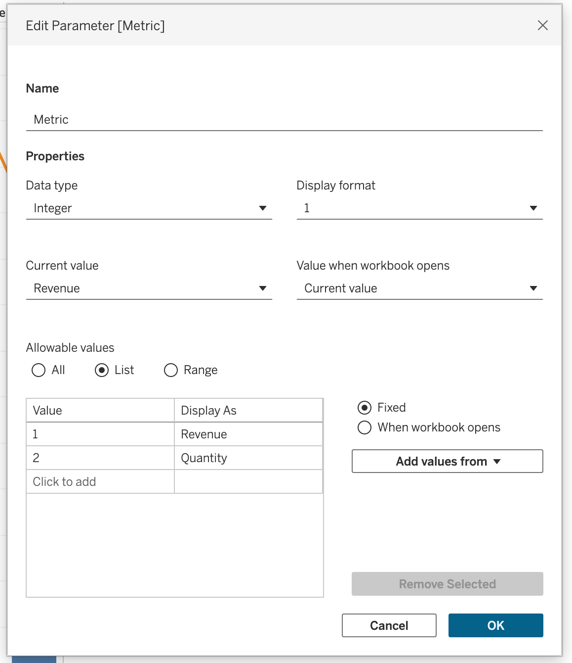 Name of the calculated field should be identical to the parameter name and can include p. in the name to make it clear that it is a calculation for the parameter.