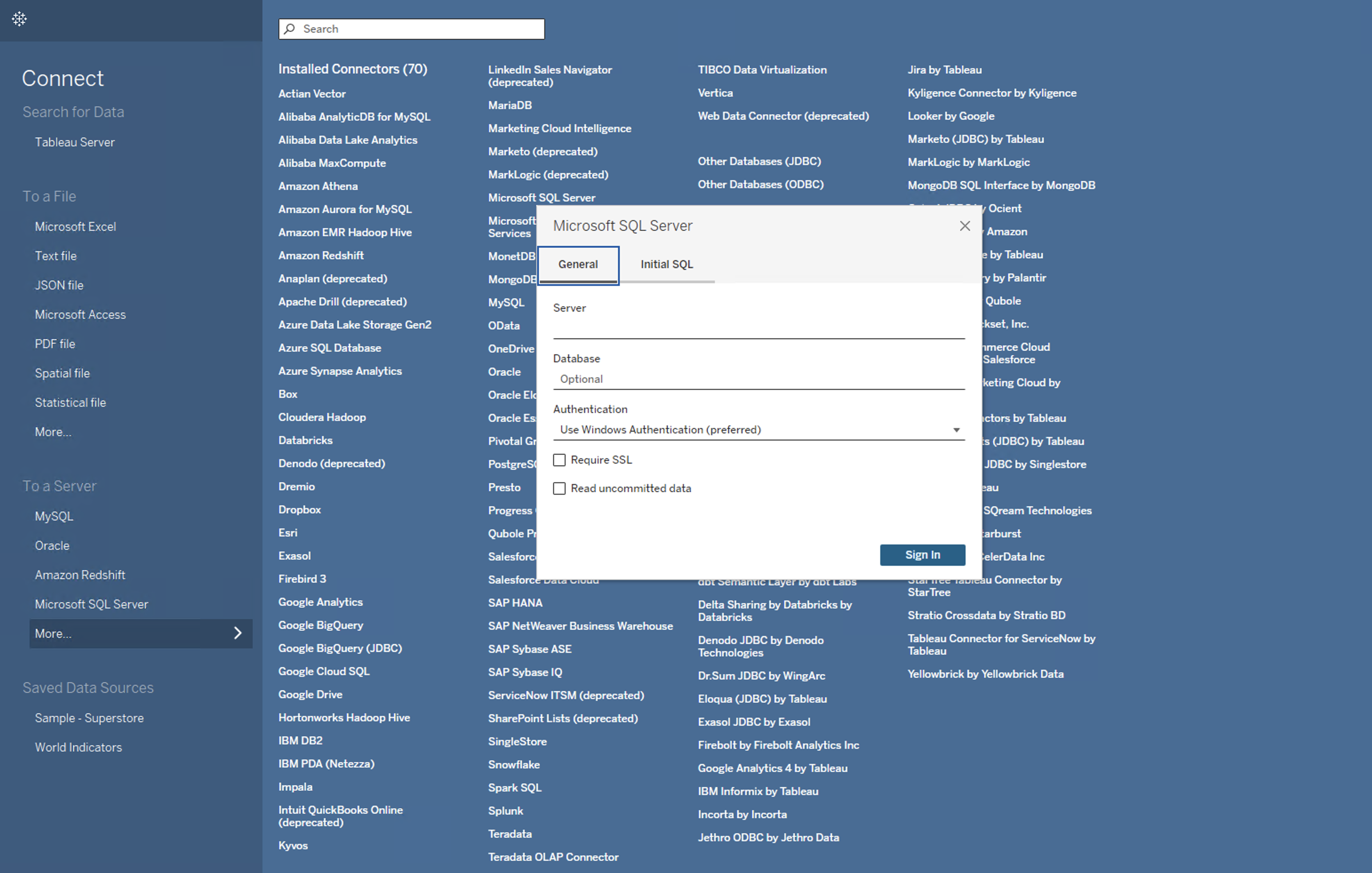 Beyond Excel and CSV files, Tableau can connect directly to relational databases.