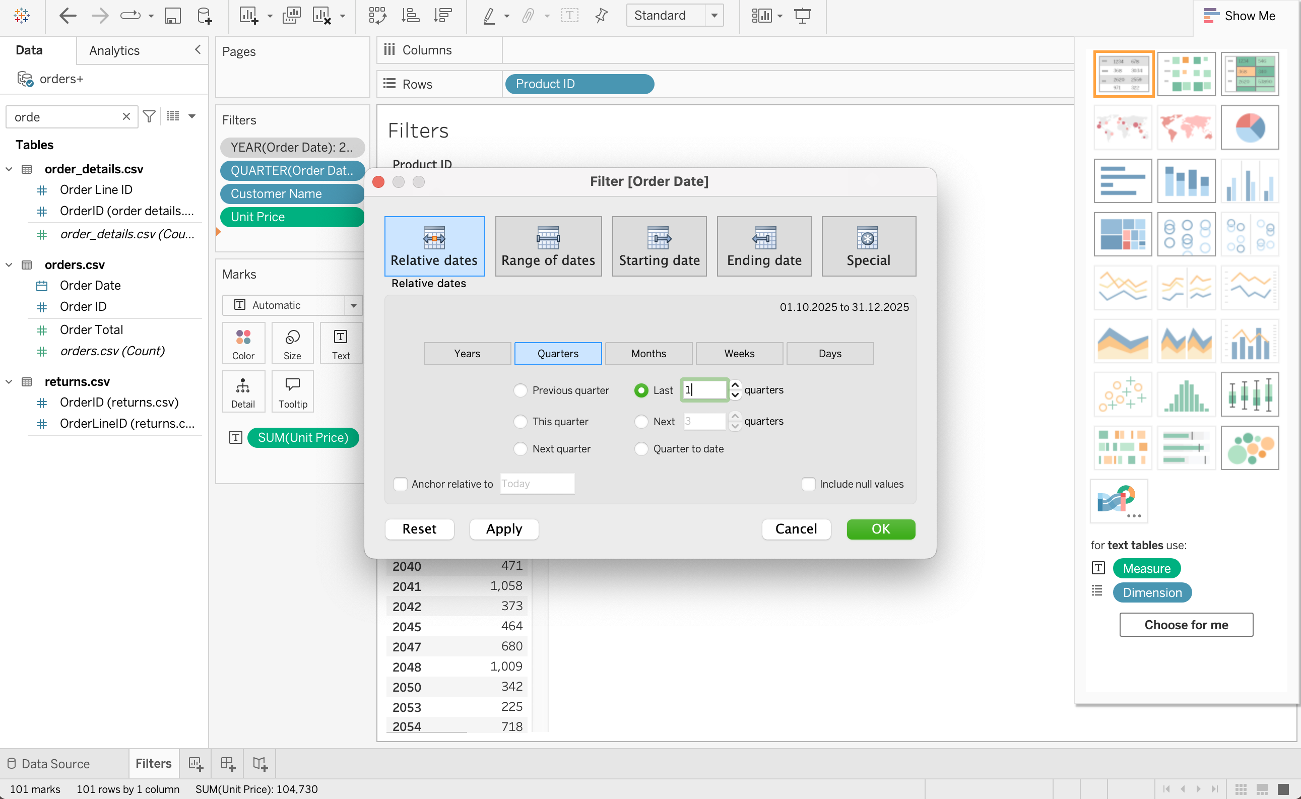 Set When workbook opens → MAX(Order Date) to always show the latest data.