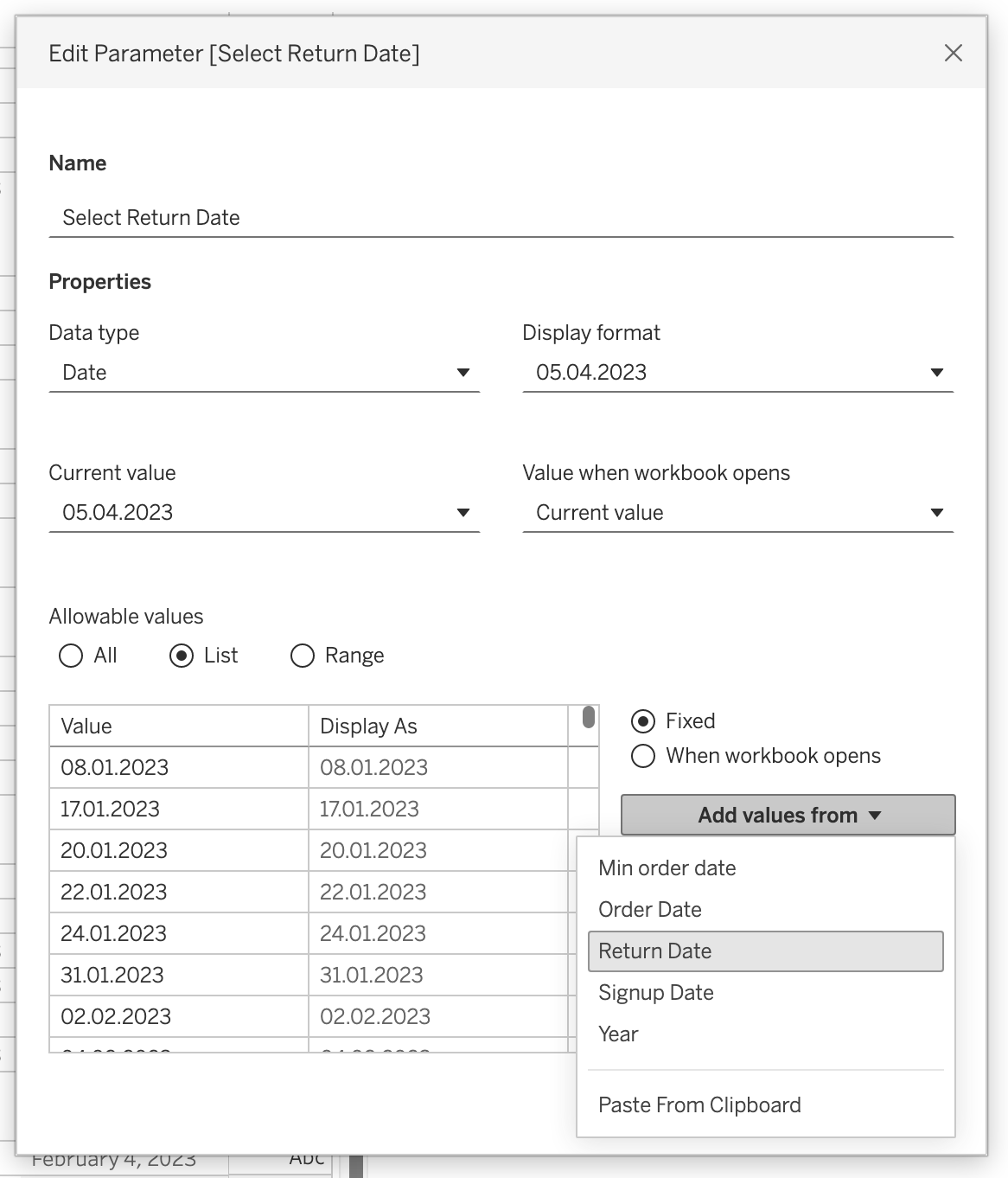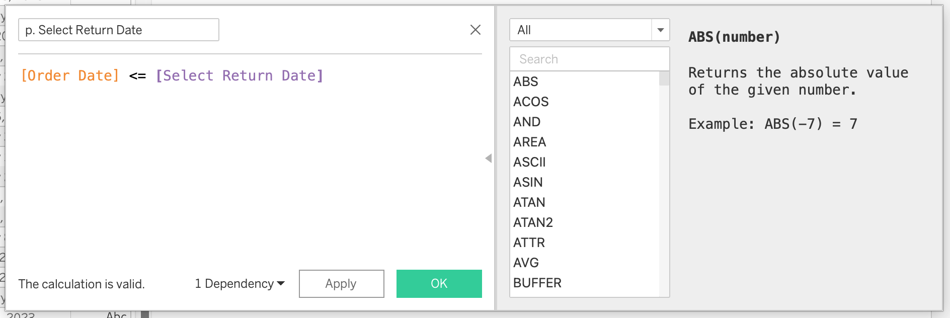 [Order Date] <= [Select Return Date]- Drag calculation to Filters