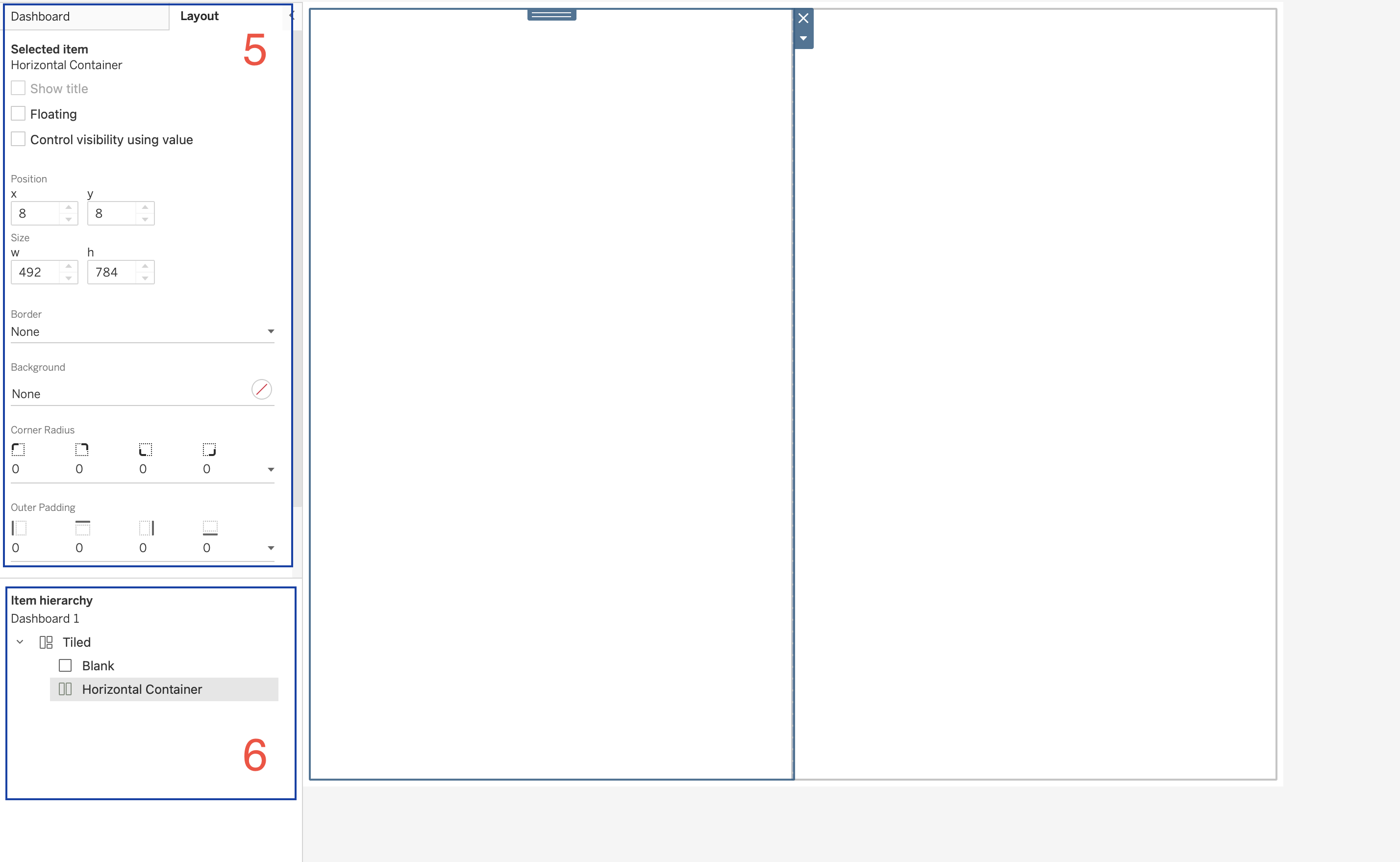 The Layout panel allows configuration of properties for the selected dashboard object.
