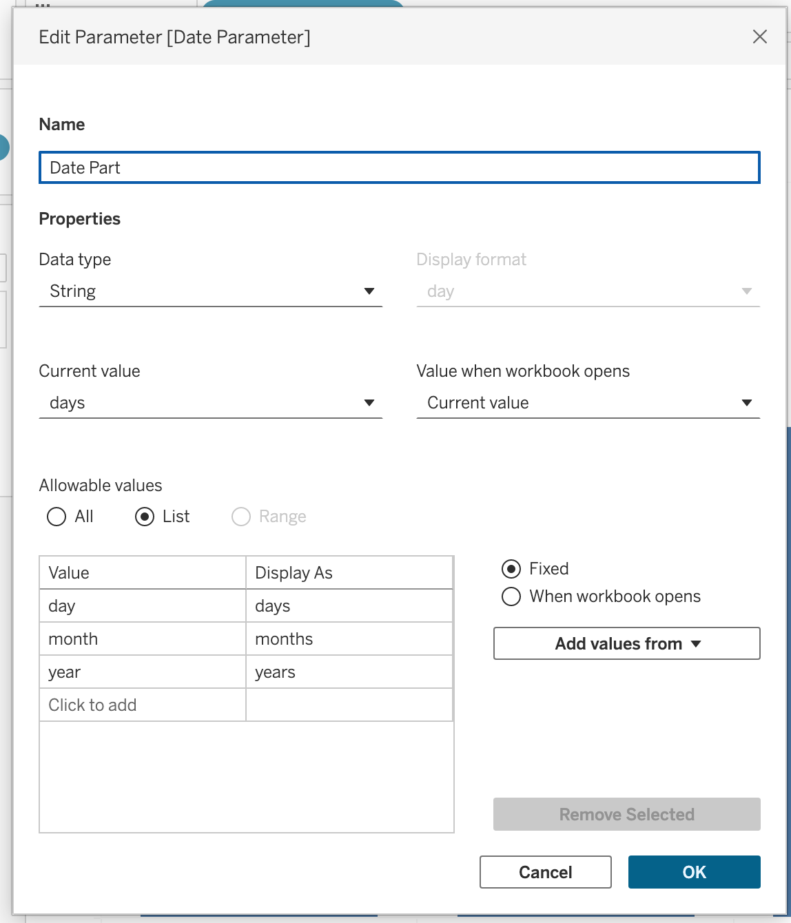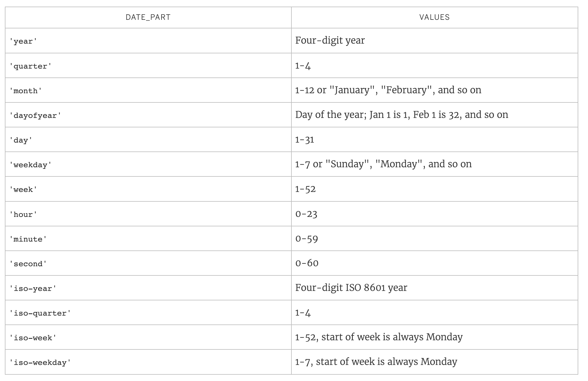Common date parts include: