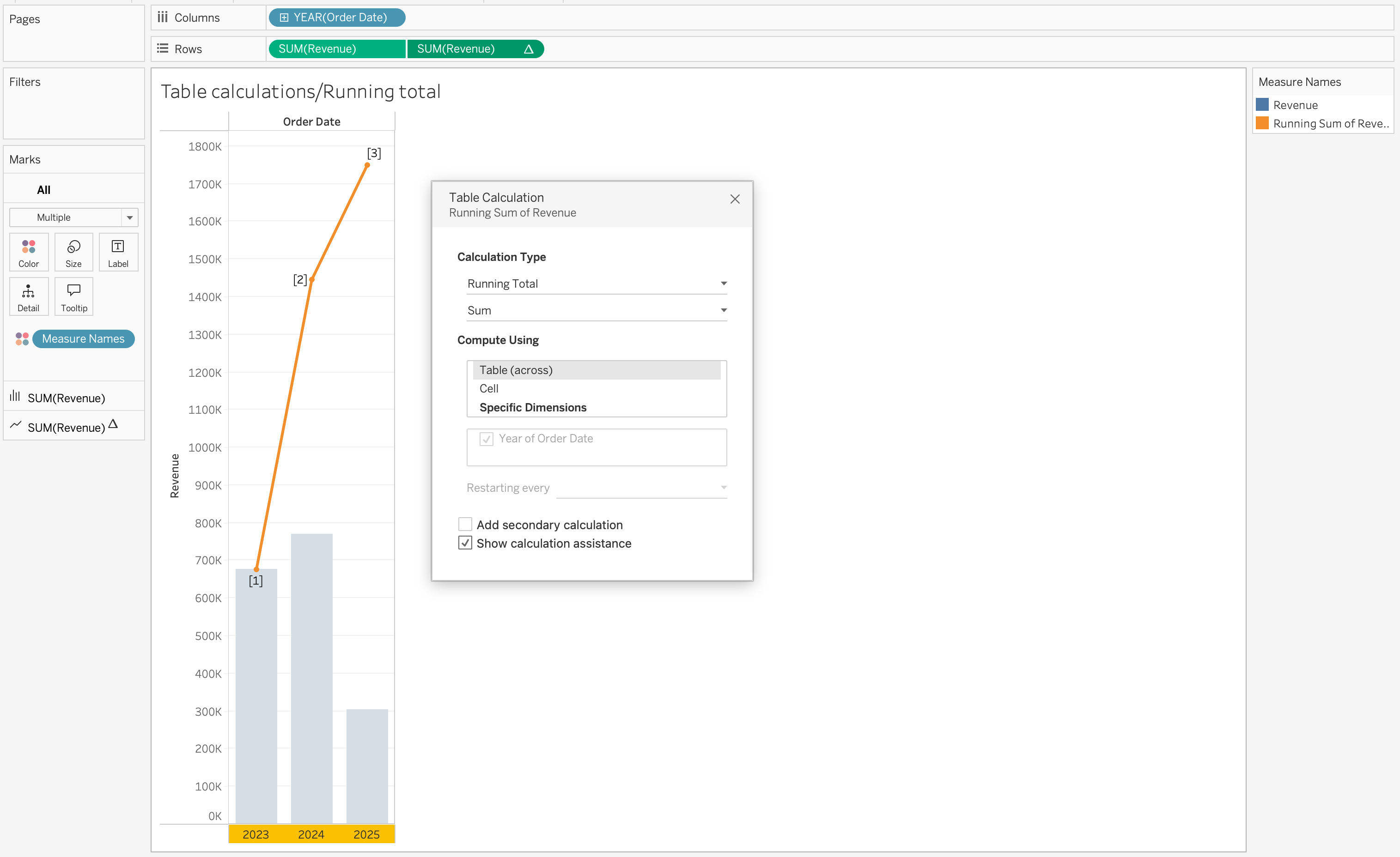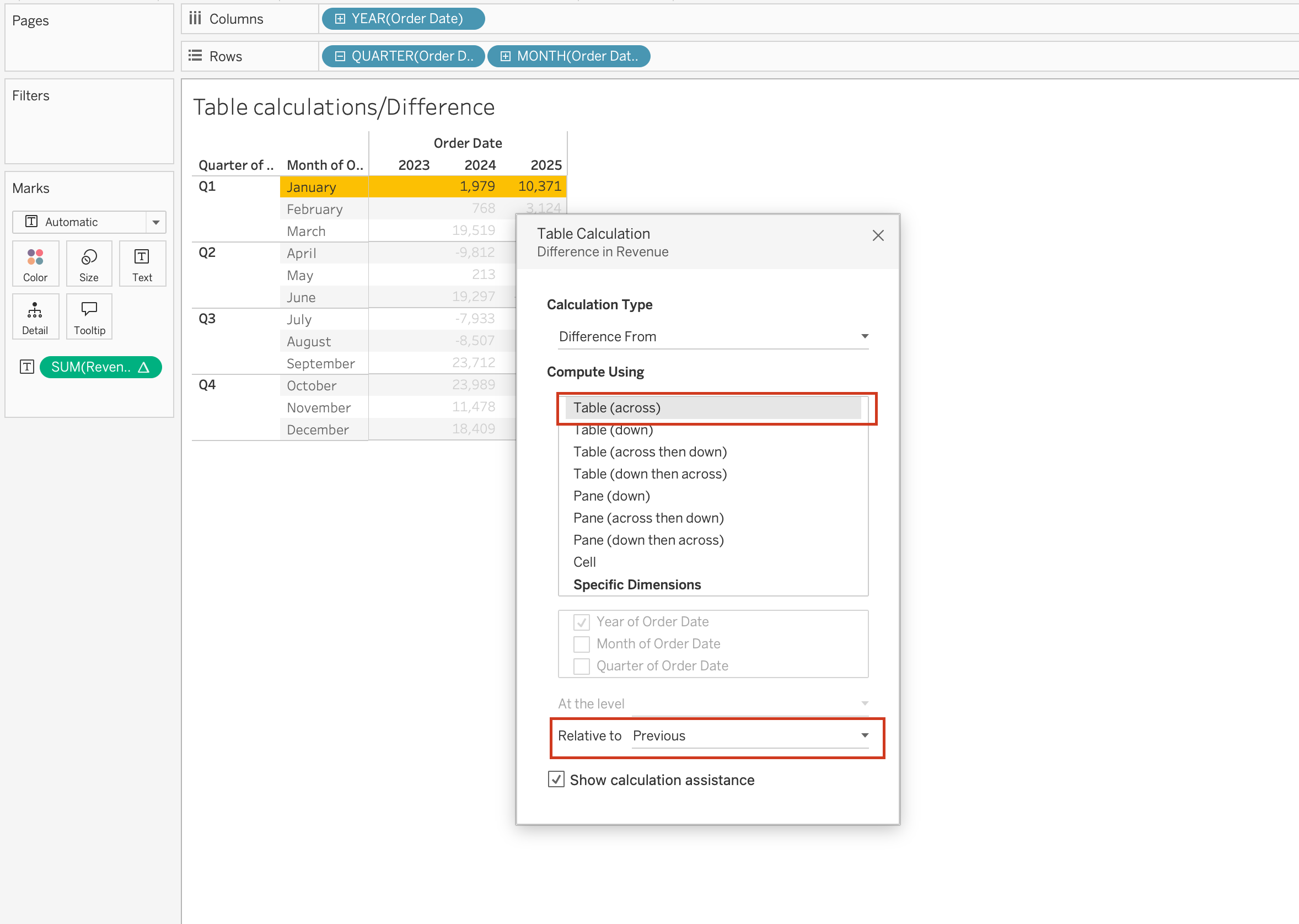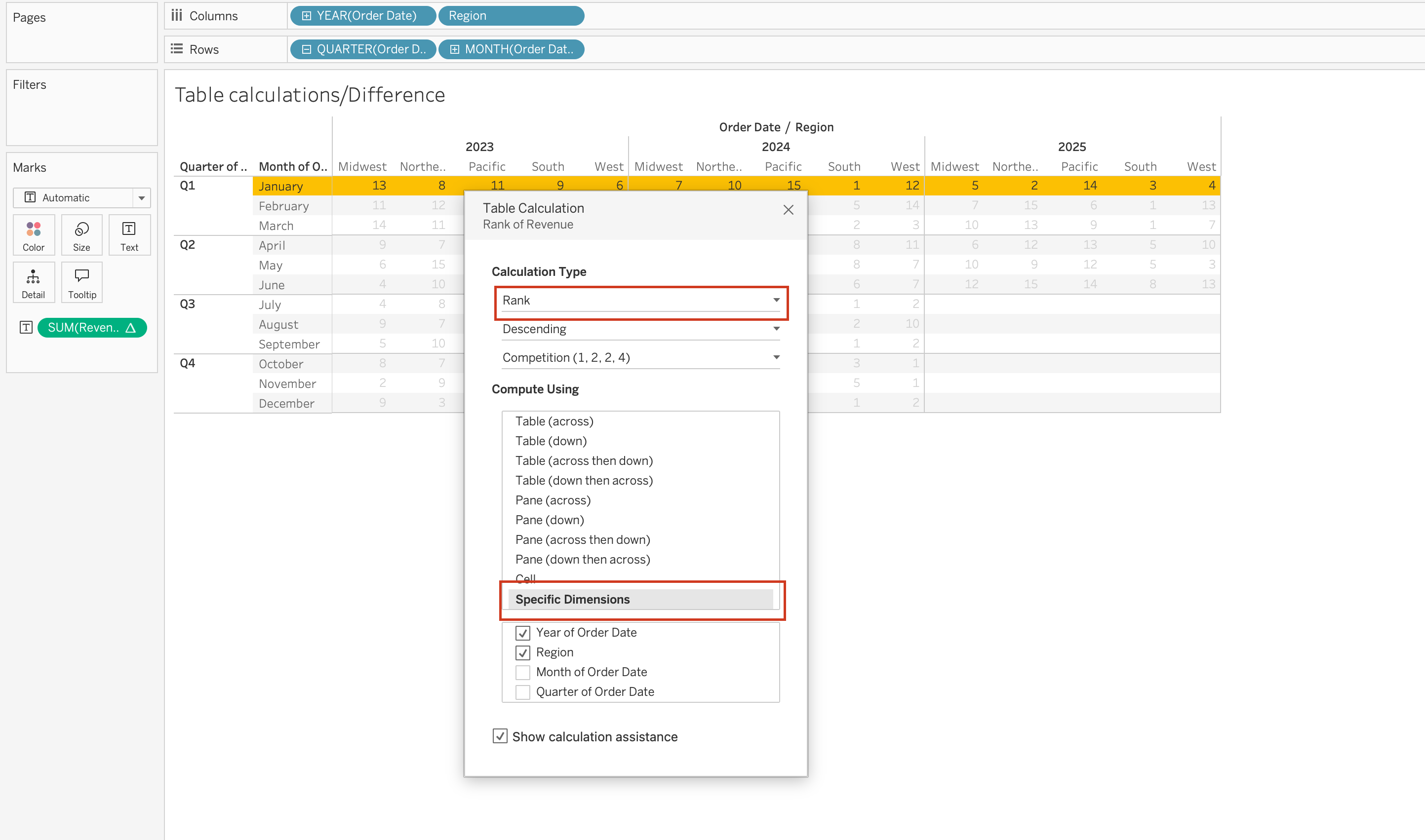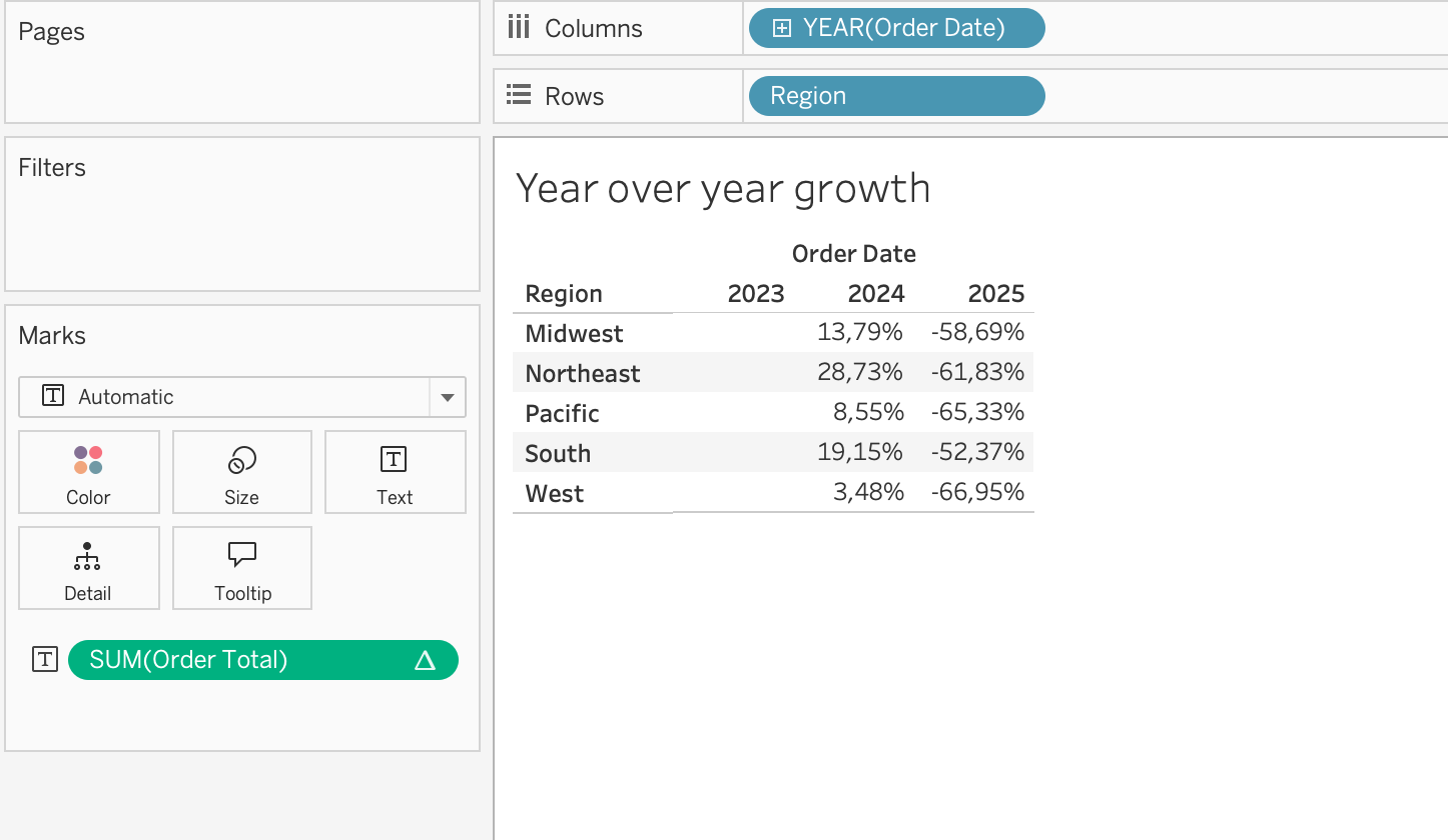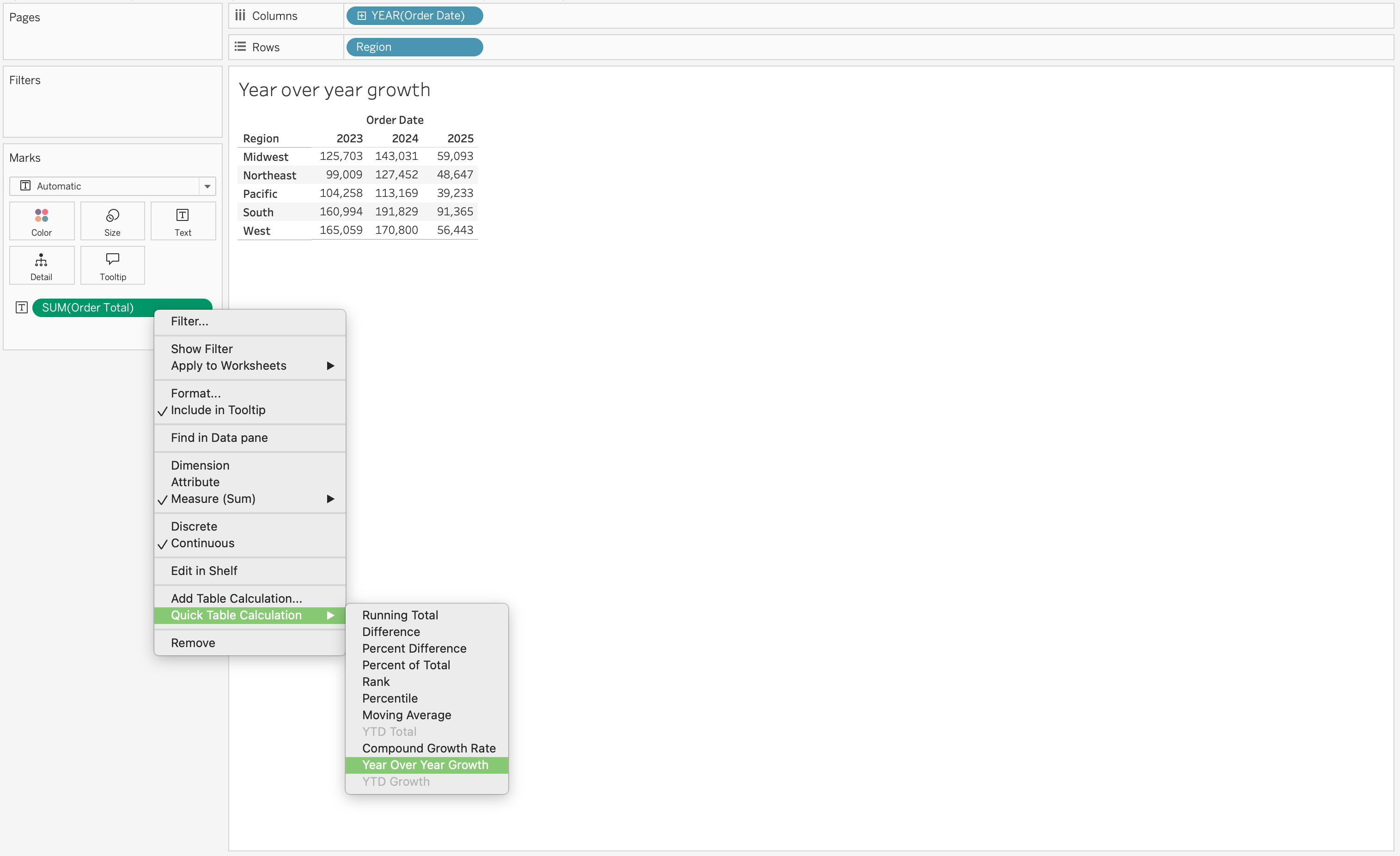 Year over year growth is another common use case for table calculations on the Marks card. For example, if you have SUM(Revenue) on the view and you add a table calculation that calculates the year-over-year growth of Revenue by Region.
