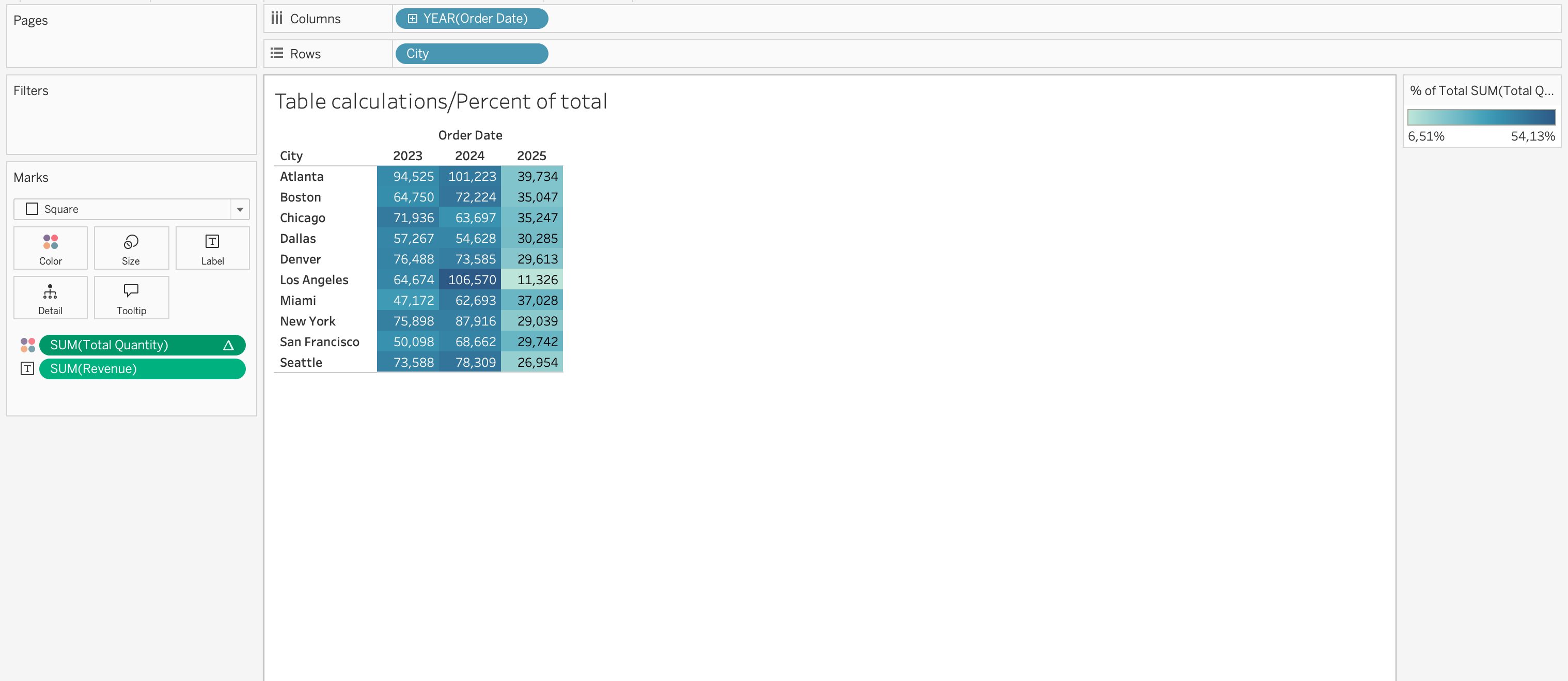 When you place a table calculation on the Marks card Color, the table will be colored based on the Measure you have on the view SUM(Revenue) and the table calculation you have on the Color SUM(Total Quantity) will color the Revenue values based on the quantity values.