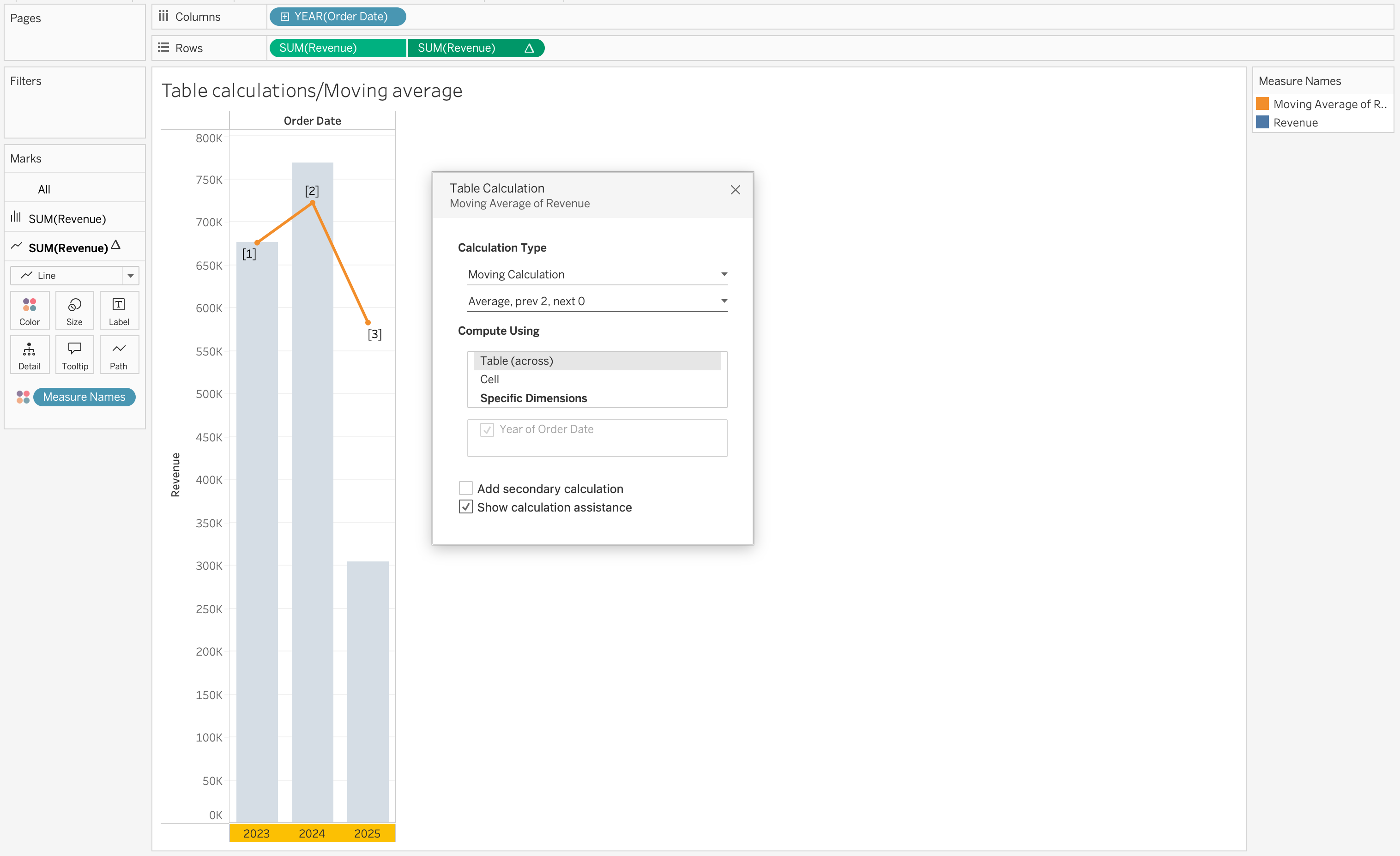 When you place a table calculation on the Rows or Columns shelf, the table will be calculated based on the Measure you have on the view SUM(Revenue) and the table calculation you have on the Rows or Columns Moving Average will add a moving average line to the view based on the Revenue values.