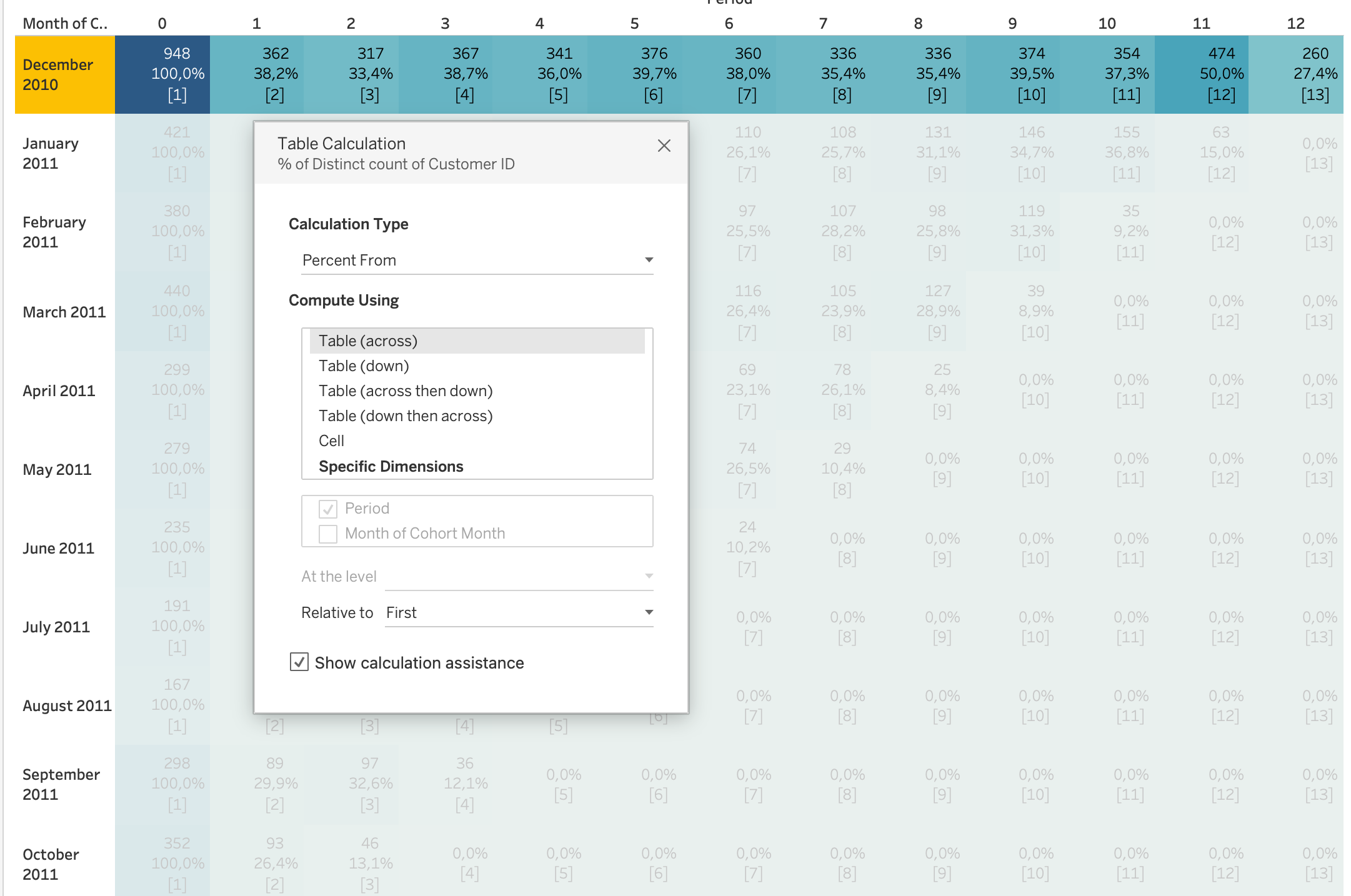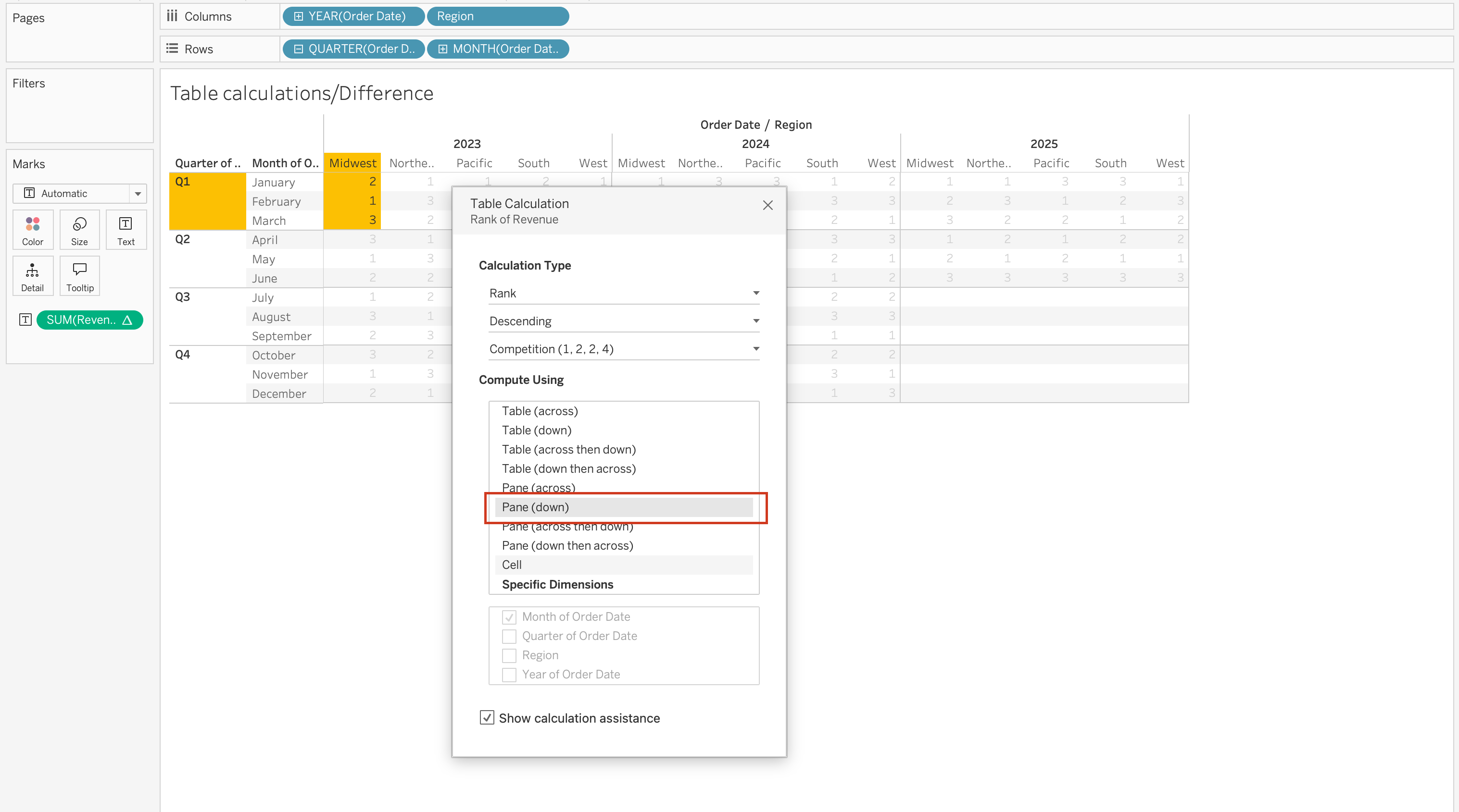Pane (Down) - Checked dimensions define how Tableau computes the table calculation across the view:
