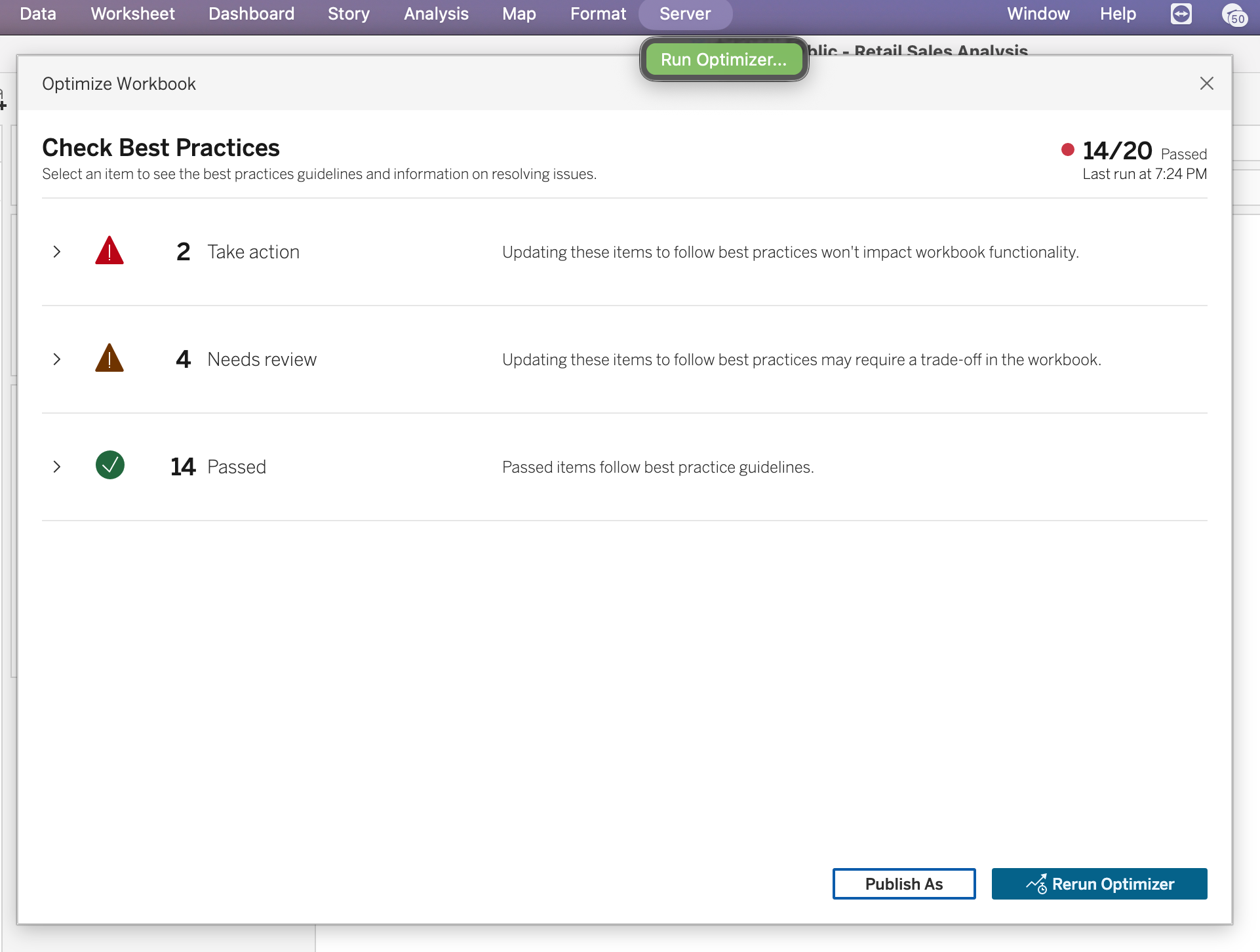 The Workbook Optimizer is a built-in tool that evaluates whether a workbook follows Tableau performance best practices.